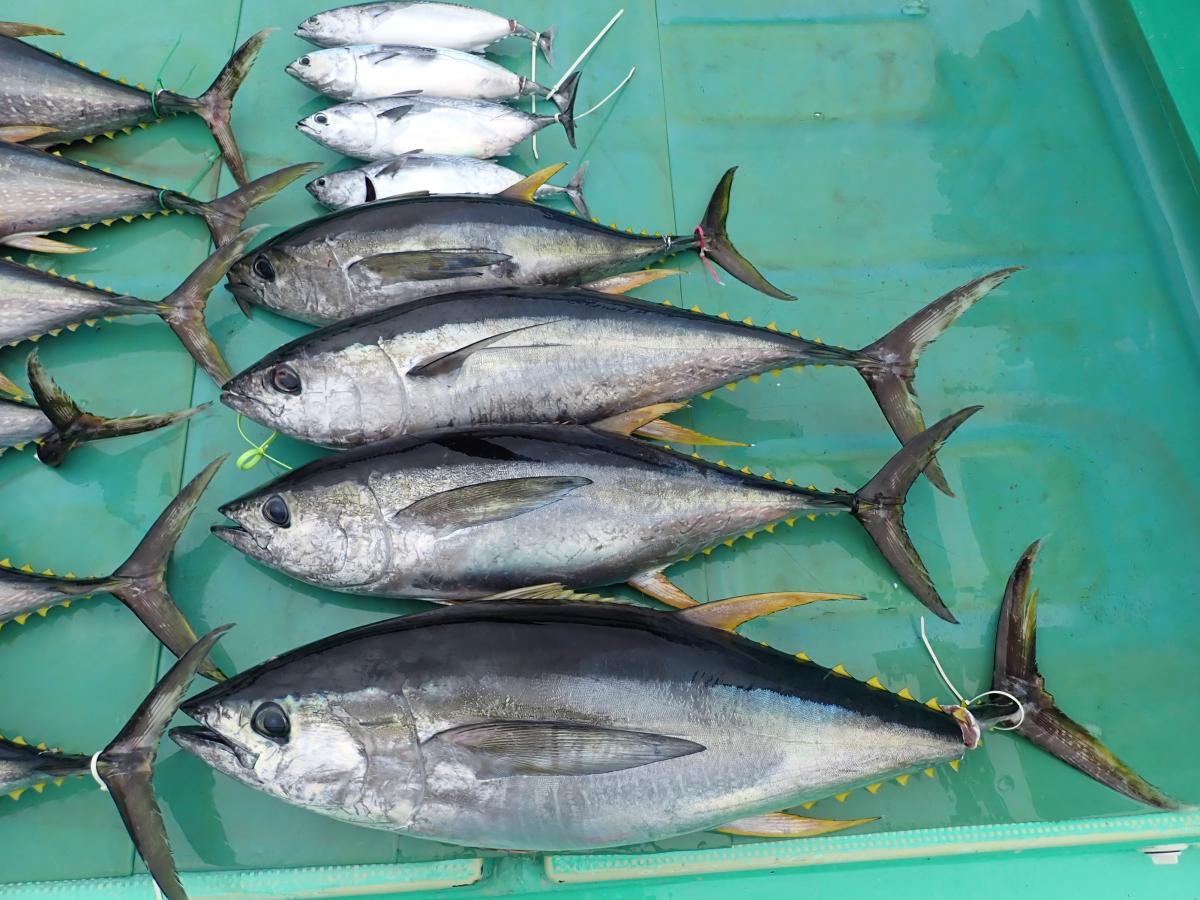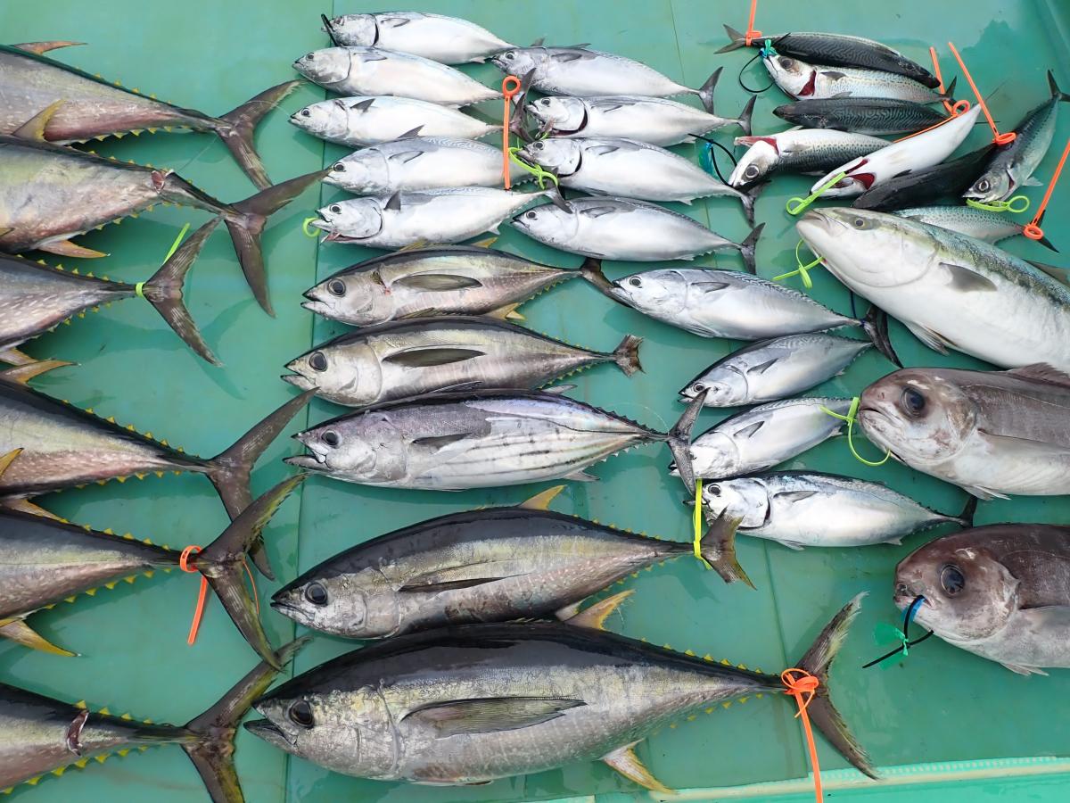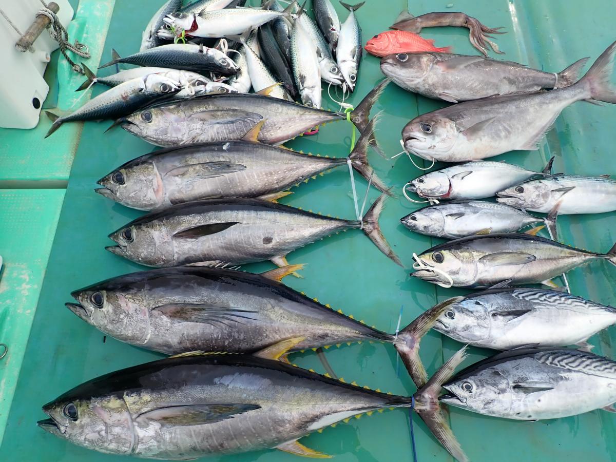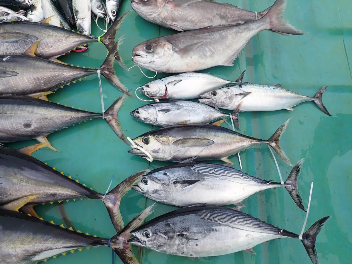 キハダ、キメジ、カツオ、ヒラソウダ、メダイ他。