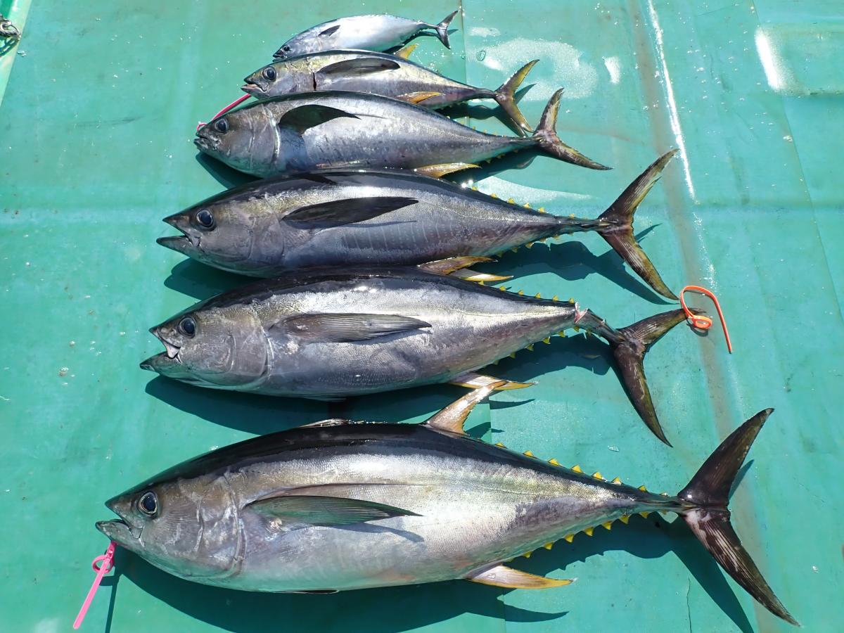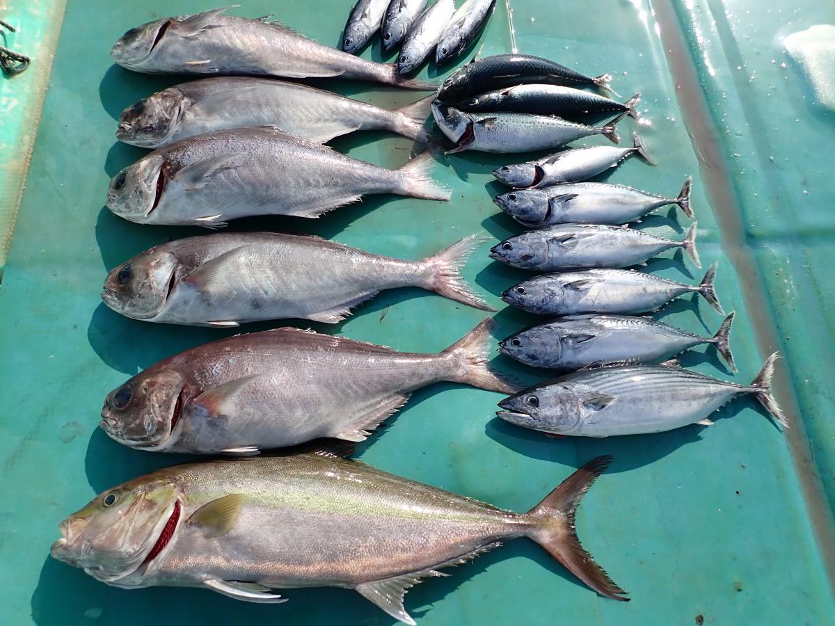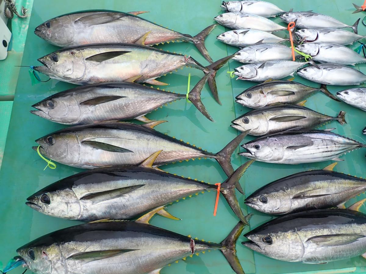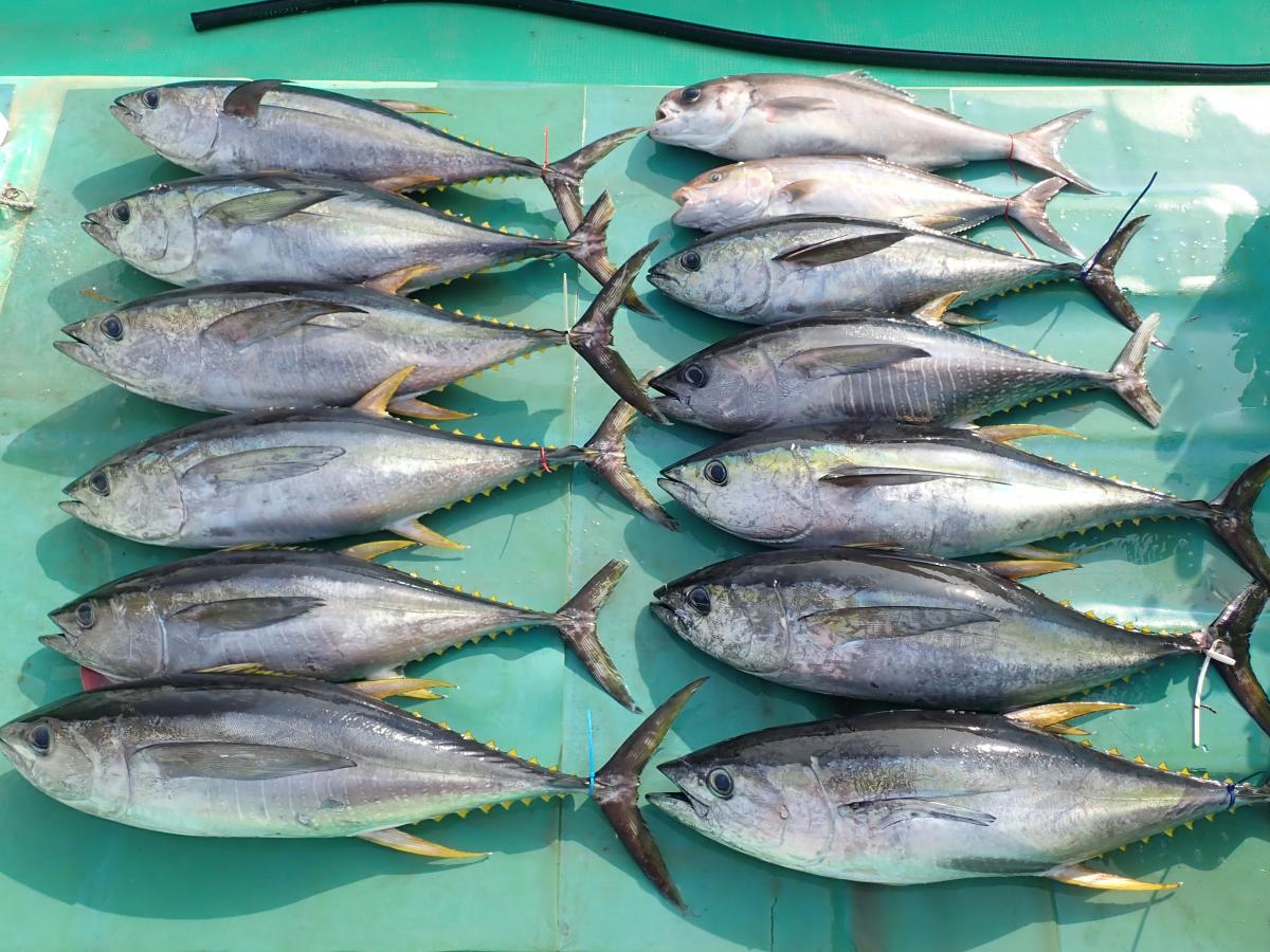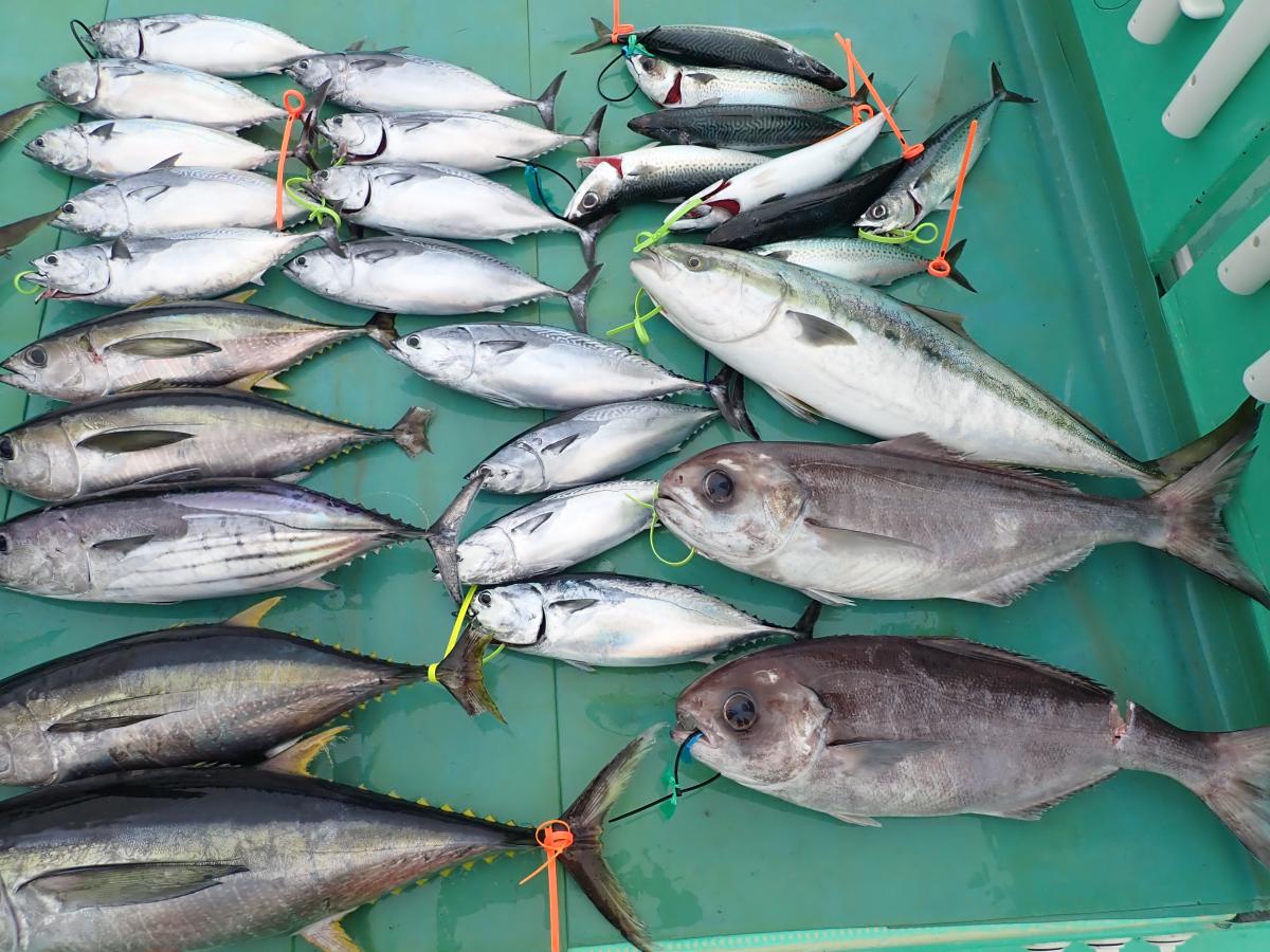キハダ、キメジ、カツオ、ヒラソウダ、メダイ他。